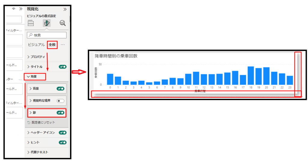 ⑬「全般」タブで「効果」をクリックして「影」を有効にします。可視化は以下の画像通り表示されます。
