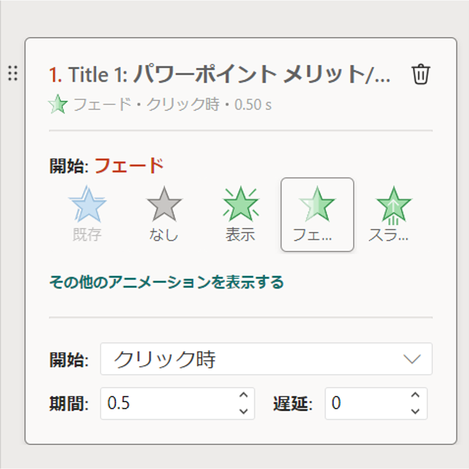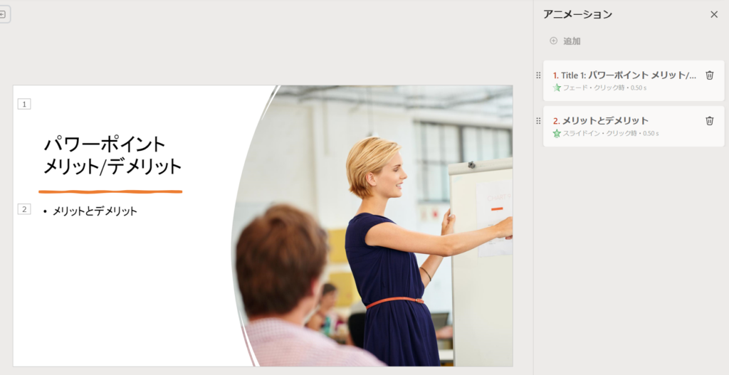アニメーションウィンドウの何よりのメリットは、複数アニメーションがあった場合に、分かりやすく順に表示されることにあります。
