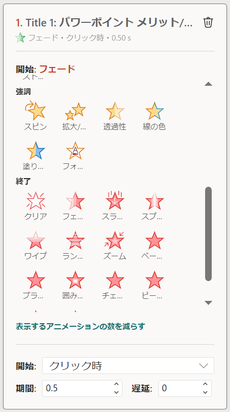 もちろん、開始以外にも、強調・終了のアニメーションも選択可能です。