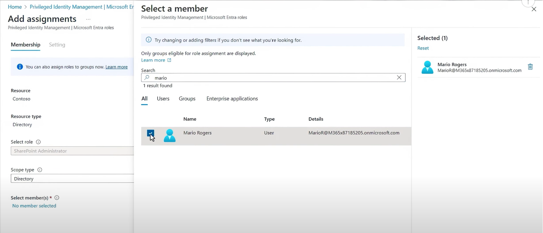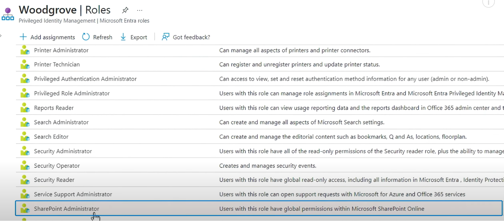 こちらはPIMのロール一覧画面になります。例えば、SharePointの管理者を選択してみましょう。