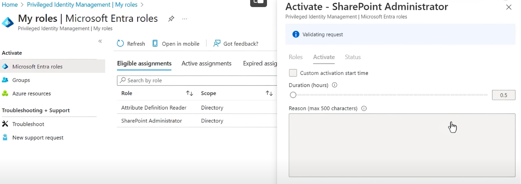 利用者は、PIMの画面から割り当てられたロールに対して、利用する時間を指定し承認を依頼します。