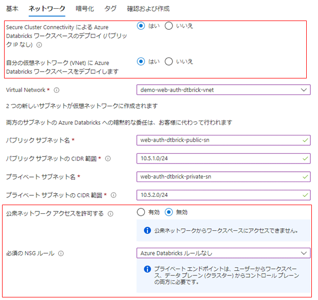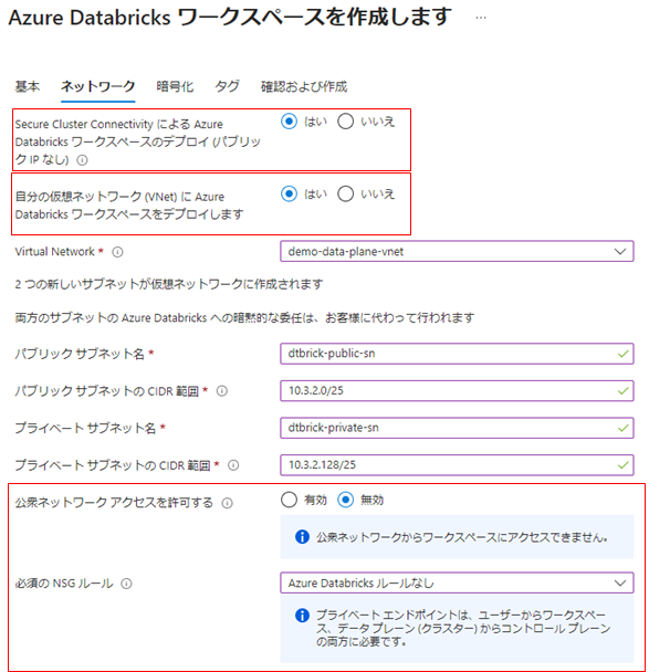 ・Azure DatabricksワークスペースでVnetインジェクションを実施できること。