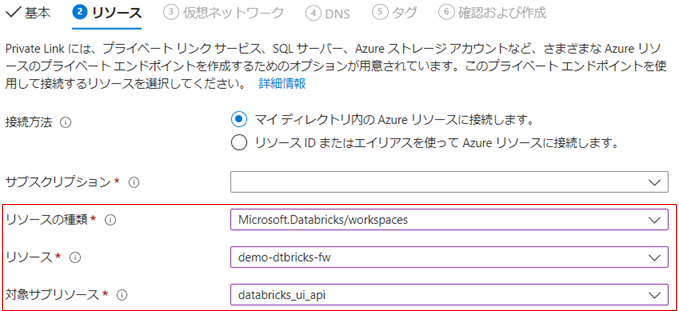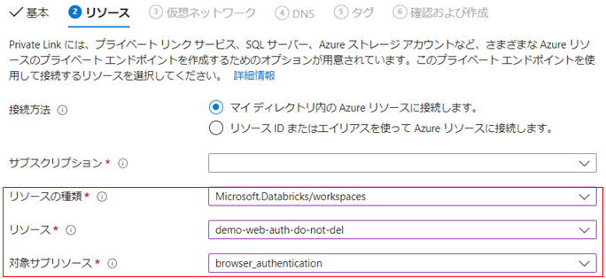 注意:該当のワークスペースを選択して、対象サブリソースにdatabricks_ui_apiを選択します。