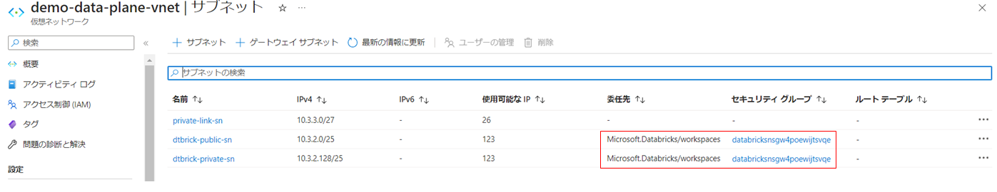 本件にDatabricksワークスペースのサブネットは以下の通りです。
