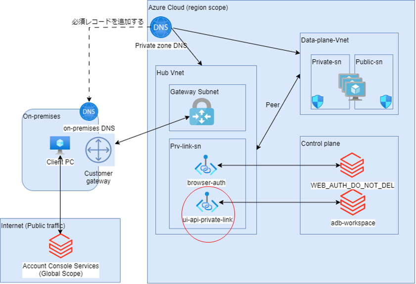 ・ ui-api private link: トランジットVnetからメインワークスペースのコントロールプレーンのウェブへ接続します。または、データプレーンからメインワークスペースコントロールプレーンへ接続します。