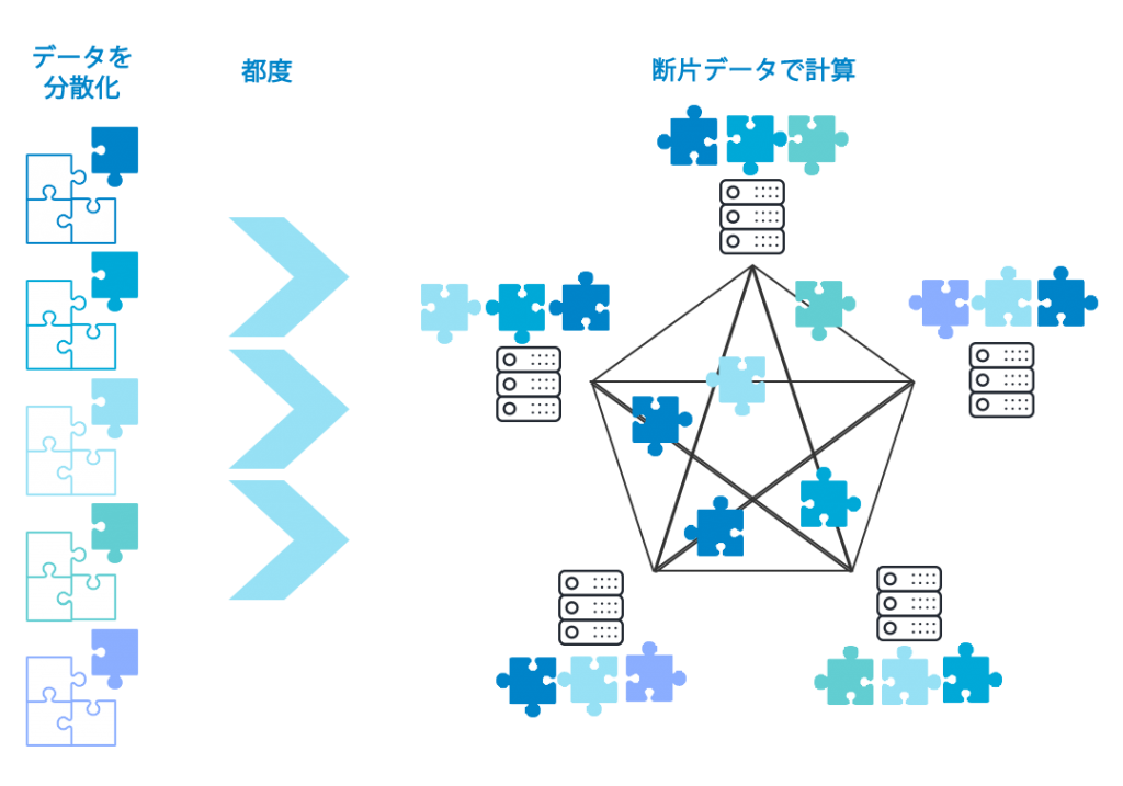 秘密分散は、元のデータを複数の断片情報に分割し、秘匿性を高める方法です。分割した個別の断片は異なるサーバに、それ自体は意味のないデータとし配置されます。そしてMPC(Multi Party Computation)と呼ばれる手法で、各サーバ間で通信をしながら断片化したデータの検索や分析を行います。分析の結果もそれぞれのサーバ内では断片情報でしかなく、そのまま読み取ることはできません。すべての結果を統合・複合化して、はじめて分析結果を知ることが可能になります。