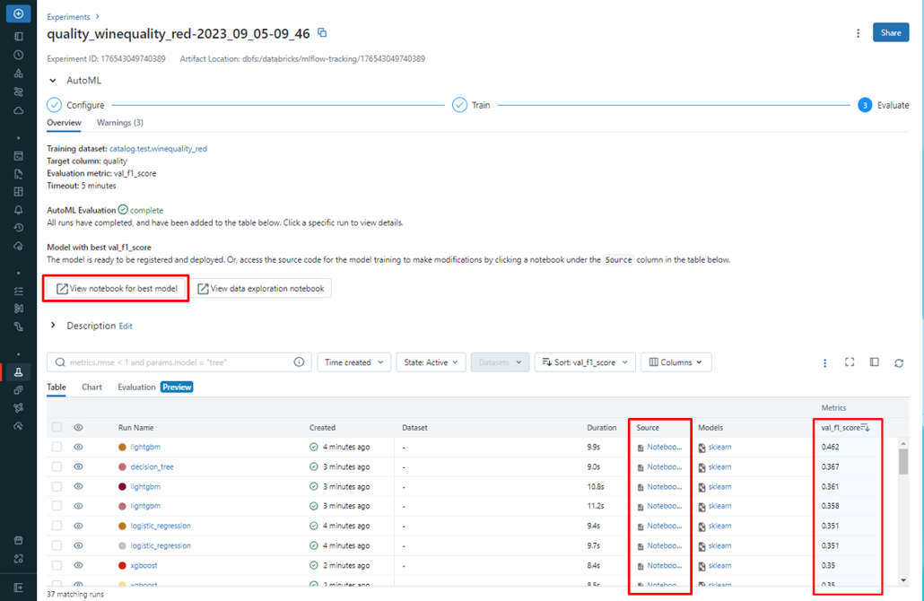 また、トレーニングされたモデルのノートブック(最適なモデルに加えて)も、モデル リストの「Source」カラムに表示されます。