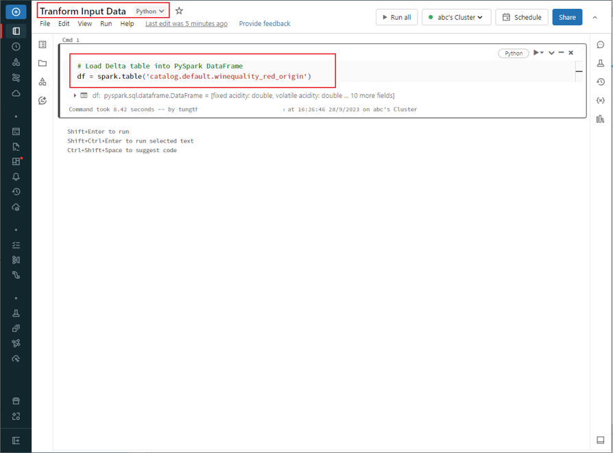 # Load Delta table into PySpark DataFrame df = spark.table('catalog.default.winequality_red_origin') |