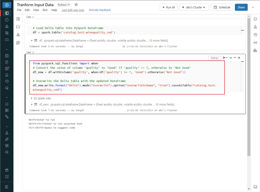df_new.write.format(“delta”).mode(“overwrite”).option(“overwriteSchema”, “true”).saveAsTable(“catalog.test.winequality_red”)