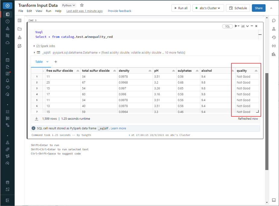 - 分類問題に変換するために、 Databricks のNotebookを使用して、quality スコアを元に quality カラムをquality ブール に変換しました。