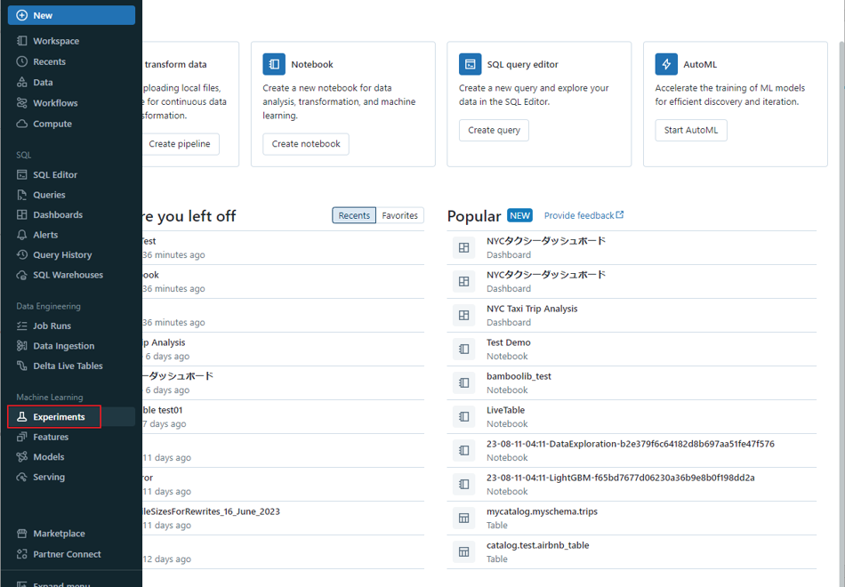 ① Databricks ワークスペースの左側のサイドバーにマウスをホバーして、「Experiments」を選択します。