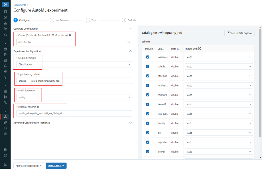 - 入力学習用データセット: Red Wine Quality データセットの作成したデルタ テーブルを使用します。