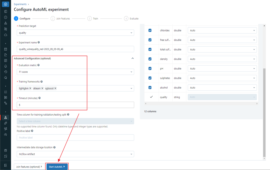 ⑤ 全ての構成を設定したら、「Start AutoML」をクリックして、分類アルゴリズムの様々な反復をトレーニングします。