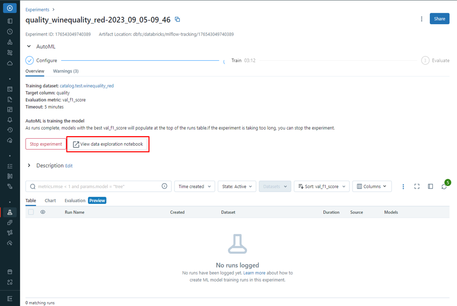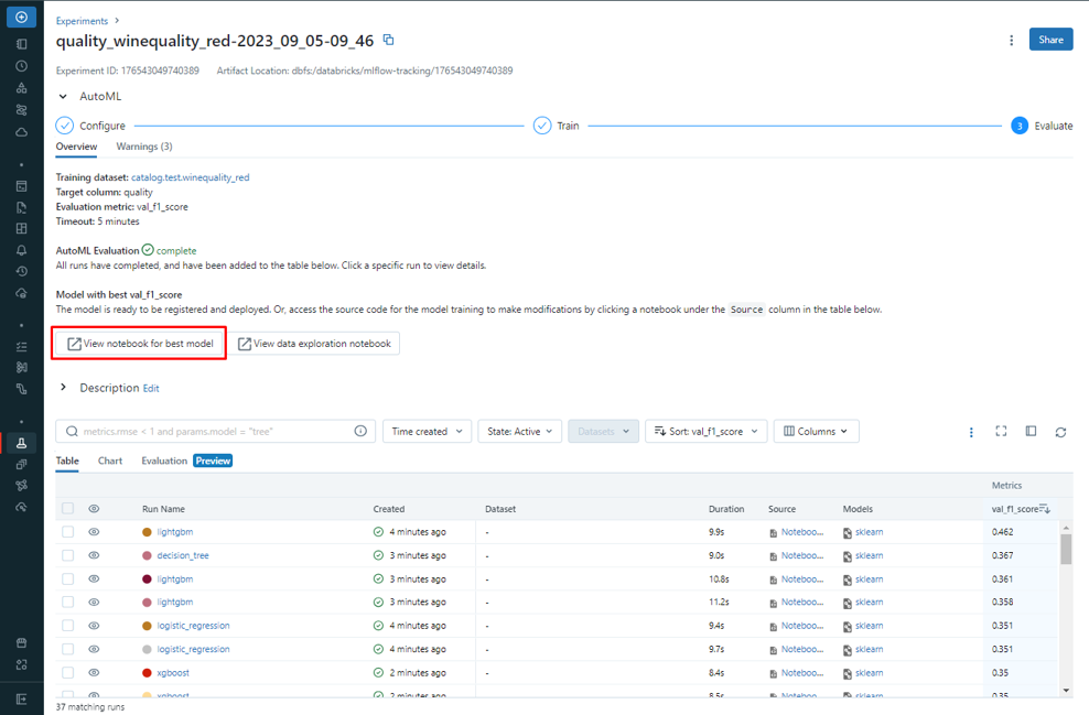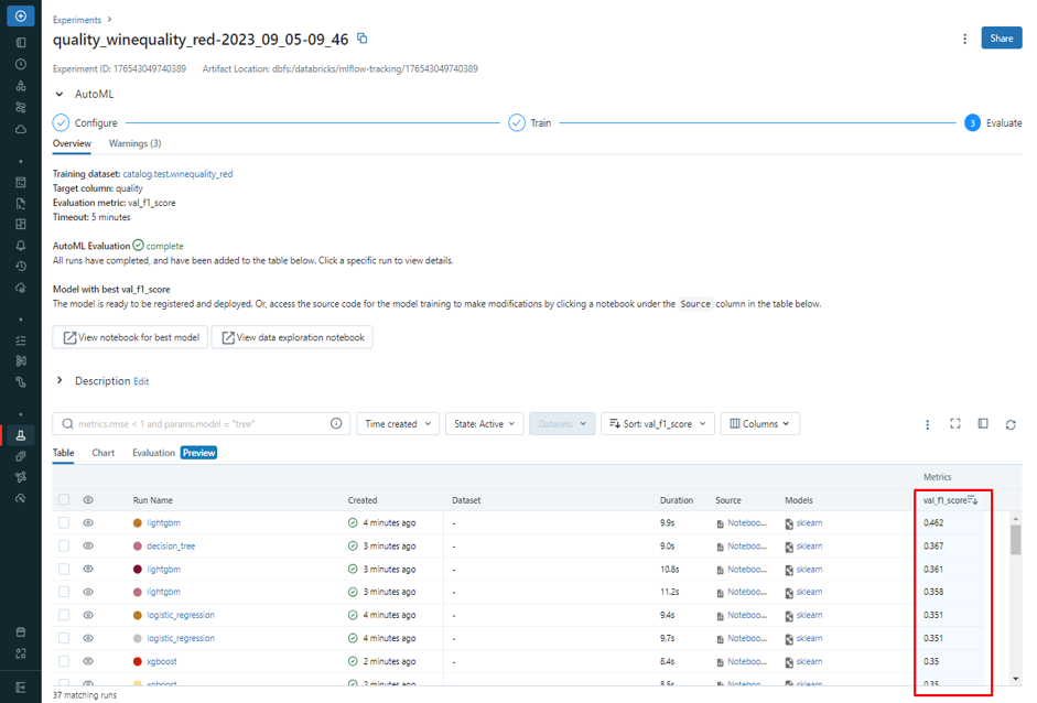 Databricks AutoML は、最も高い f1-score 値に従ってモデルを自動評価し、最適なモデルを提案します。そのため、AutoML でトレーニングされたモデルを評価し、選択する必要はありません。
