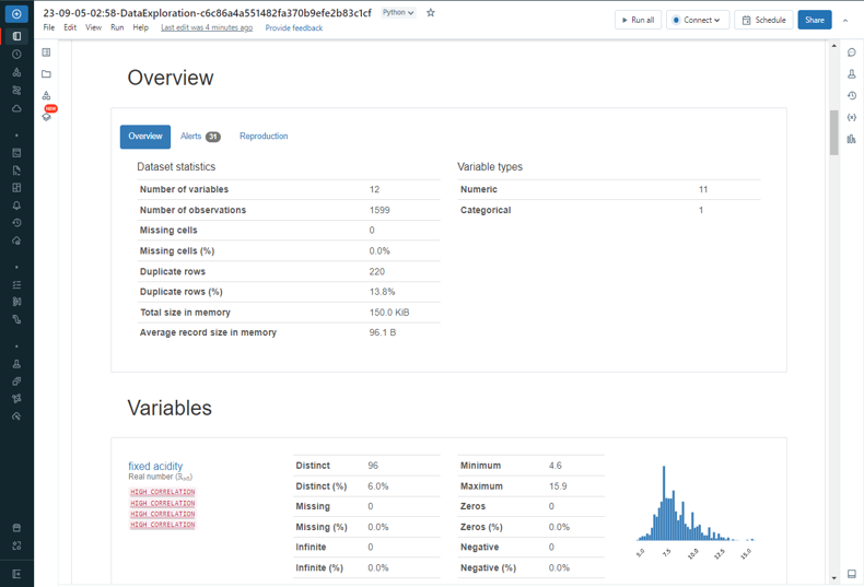 「Start AutoML」をクリックした後、Databricks AutoML はデータ探索用ノートブック (トレーニング用の使用データを詳しく説明するためのノートブック) を作成します。