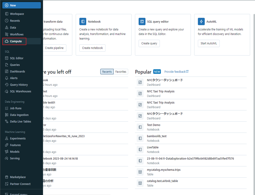 ① Databricks ワークスペースの左側のサイドバーで「Compute」をクリックします。