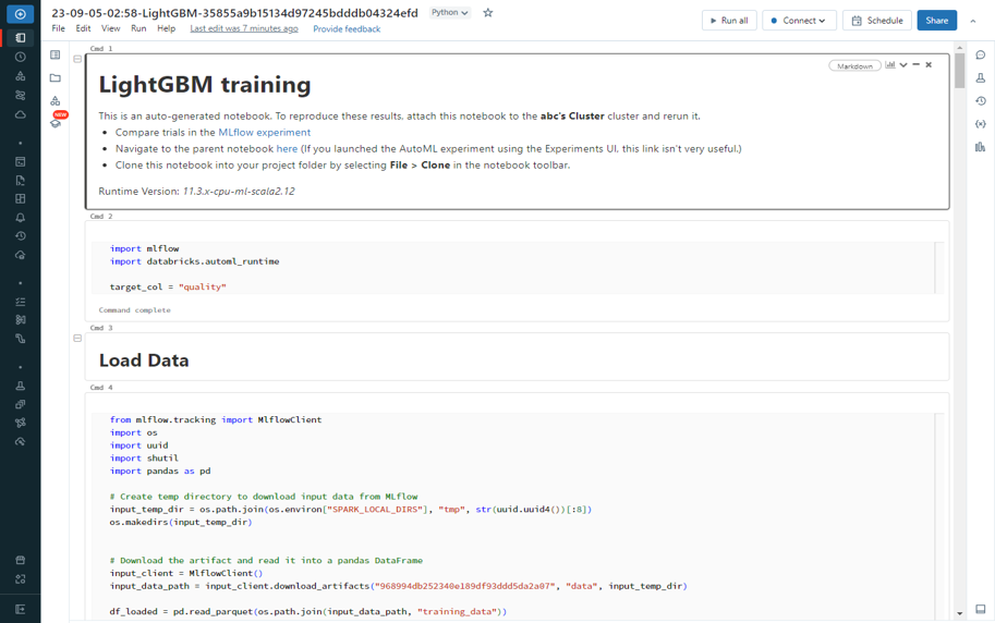 トレーニングが完了した後、Databricks AutoML は最適なモデルに対応するノートブック (最高モデルのノートブック) を生成します。