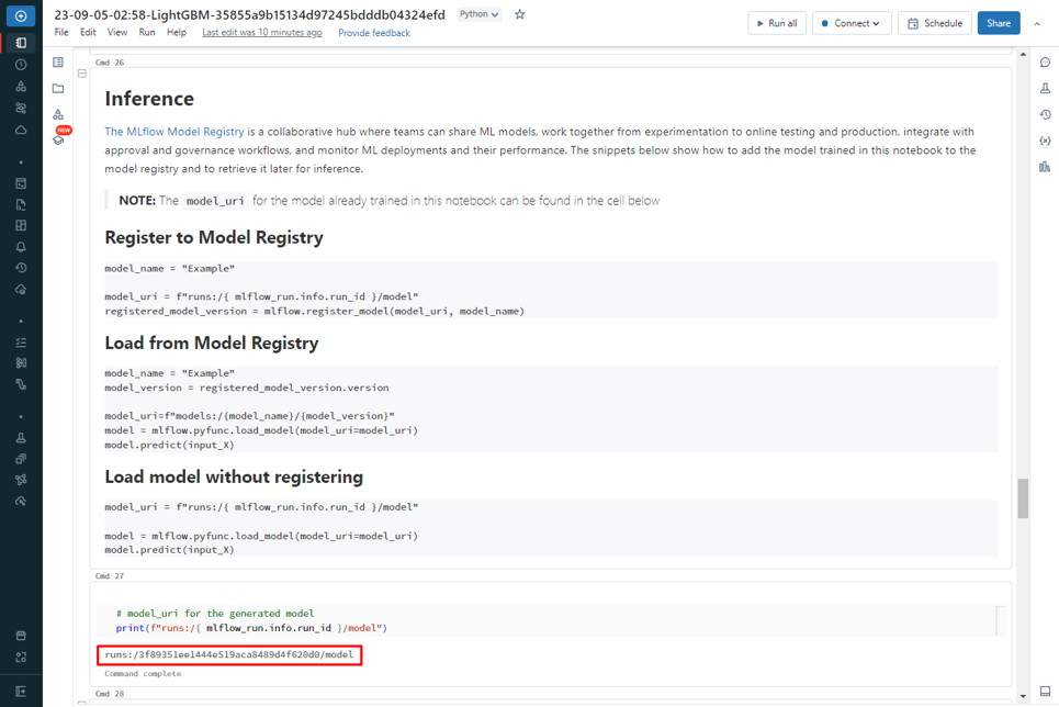 Databricks AutoML によって生成された最適なモデルの model_uri は、「 View notebook for best model 」の最後にあります。