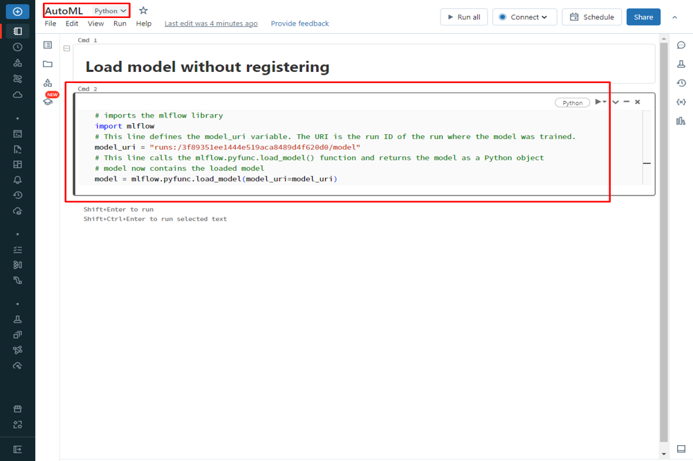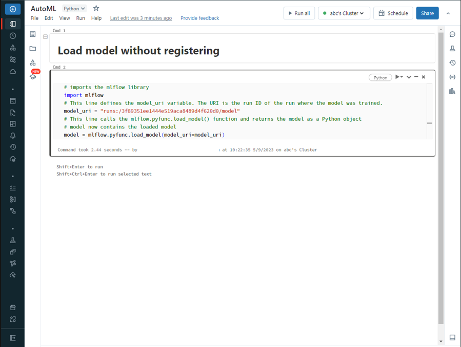 # imports the mlflow library import mlflow # This line defines the model_uri variable. The URI is the run ID of the run where the model was trained. model_uri = "runs:/9e96c40dddc64b3994ebf3768fe9bf87/model" # This line calls the mlflow.pyfunc.load_model() function and returns the model as a Python object # model now contains the loaded model model = mlflow.pyfunc.load_model(model_uri=model_uri) |