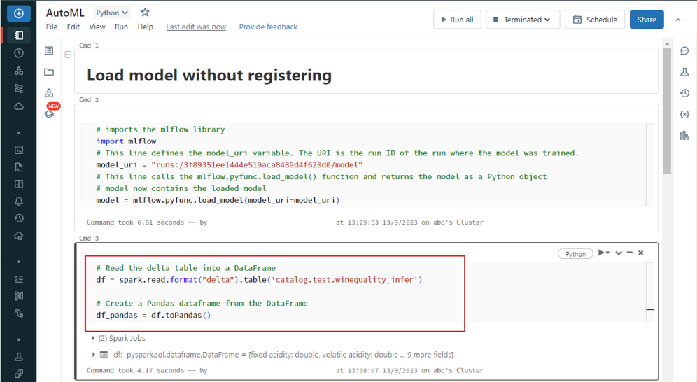 # Read the delta table into a DataFrame df = spark.read.format("delta").table('catalog.test.winequality_infer') # Create a Pandas dataframe from the DataFrame df_pandas = df.toPandas() |