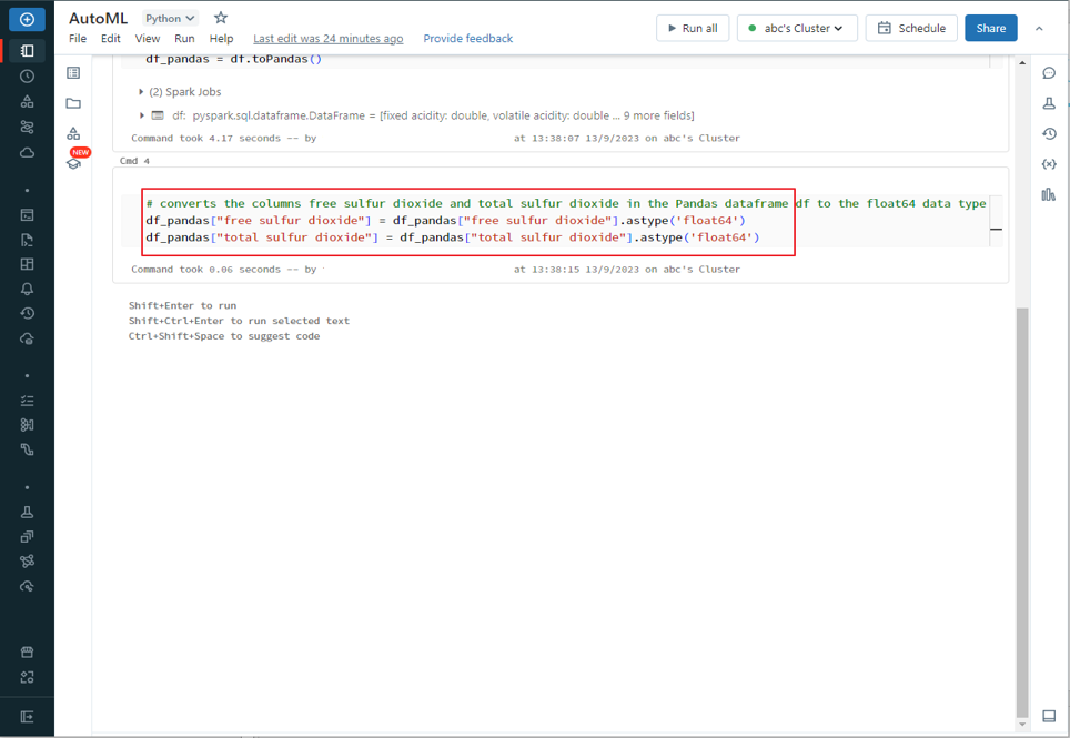 # converts the columns free sulfur dioxide and total sulfur dioxide in the Pandas dataframe df to the float64 data type df_pandas["free sulfur dioxide"] = df_pandas["free sulfur dioxide"].astype('float64') df_pandas["total sulfur dioxide"] = df_pandas["total sulfur dioxide"].astype('float64') |