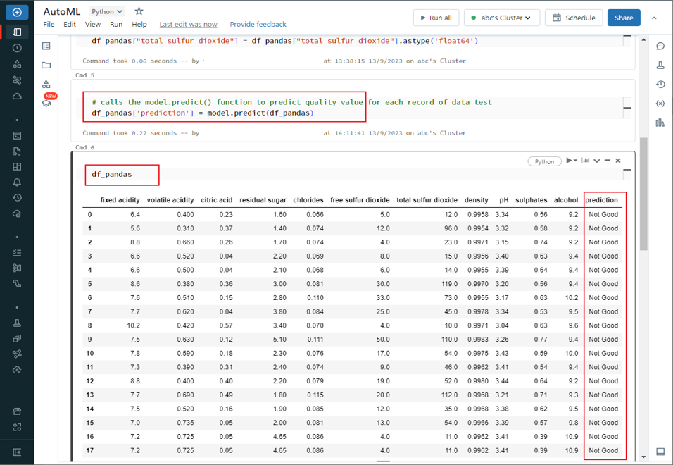# calls the model.predict() function to predict quality value for each record of data test df_pandas['prediction'] = model.predict(df_pandas) |