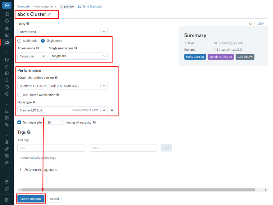 ランタイムバージョン: Databricks ランタイム 9.1 ML 以降。クラスター ML (機械学習) を使用する必要があることに注意してください。 ここでは、Scala 2.12 で Runtime 11.3 を使用します。