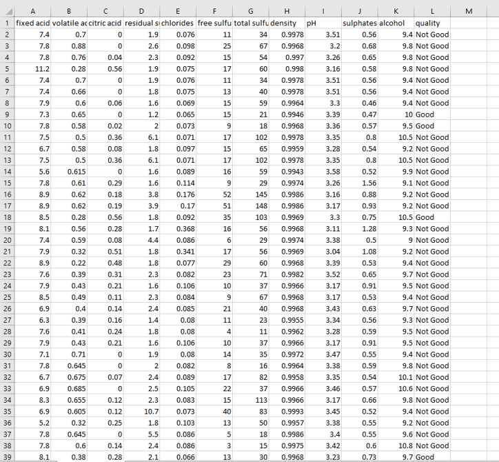 変換後のデータには、ワインの組成指数とそのワインの品質 (Good、Not Good) が含まれます。
