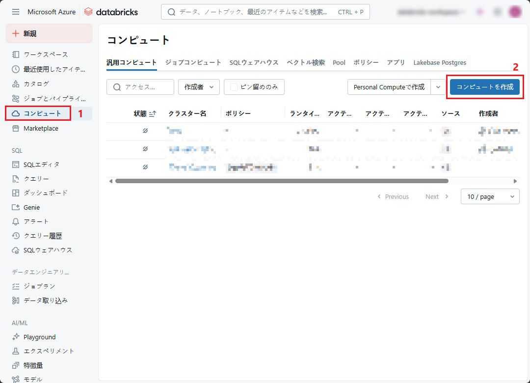 ① Databricks ワークスペースの左側のサイドバーで「コンピュート」をクリックします。