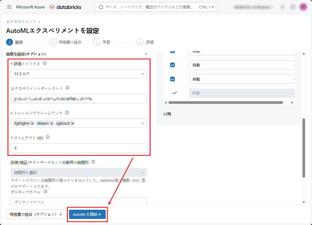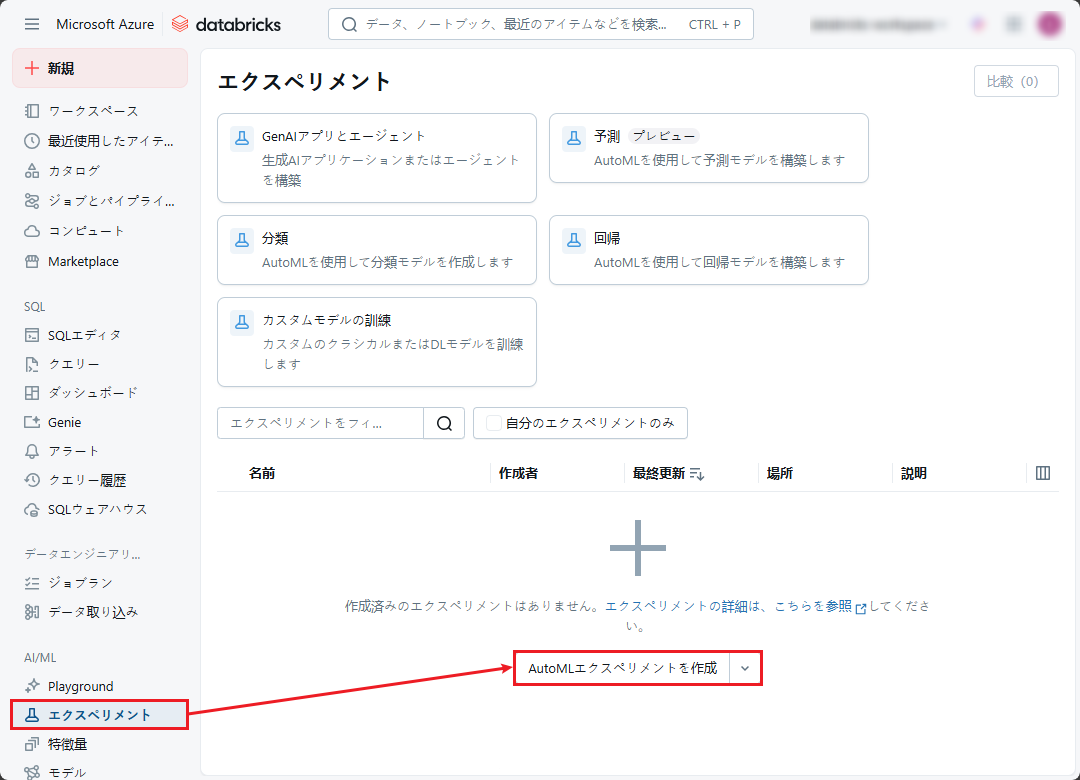 ②「AutoMLエクスペリメントを作成」をクリックします。