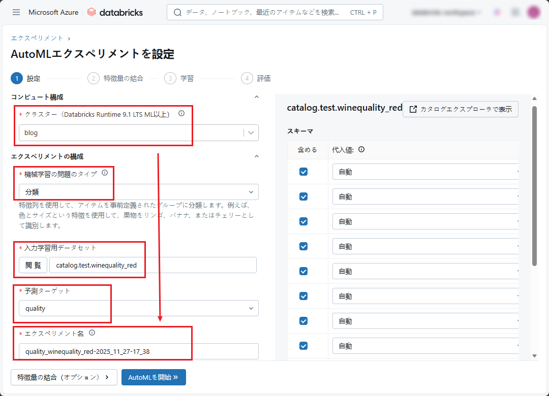 クラスター、及び入力データのテーブルを作成した後、Databricks Machine Learning の AutoML Experimentを作成します。