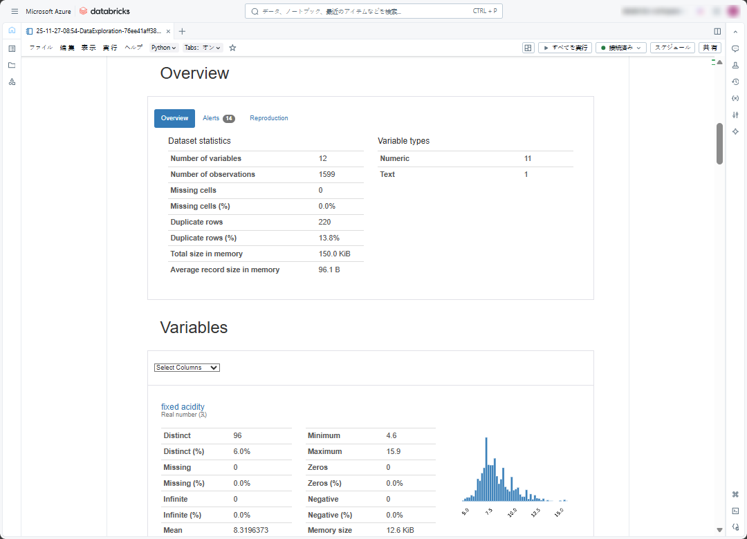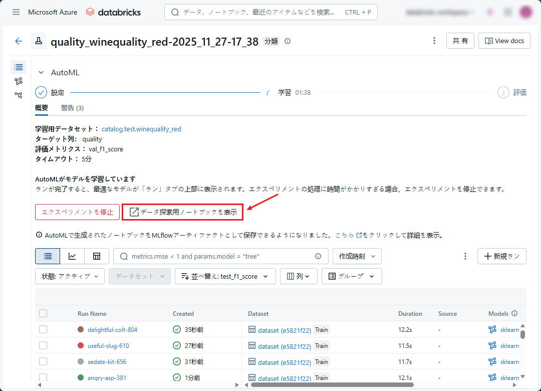 「AutoMLを開始」をクリックした後、Databricks AutoML はデータ探索用ノートブック (トレーニング用の使用データを詳しく説明するためのノートブック) を作成します。