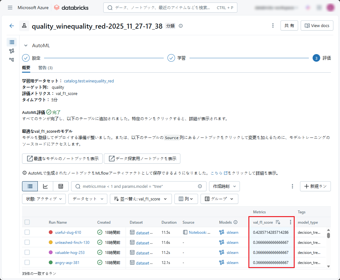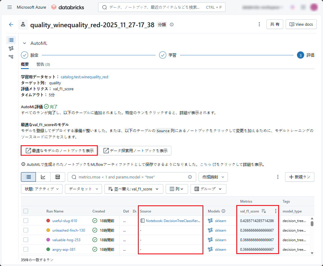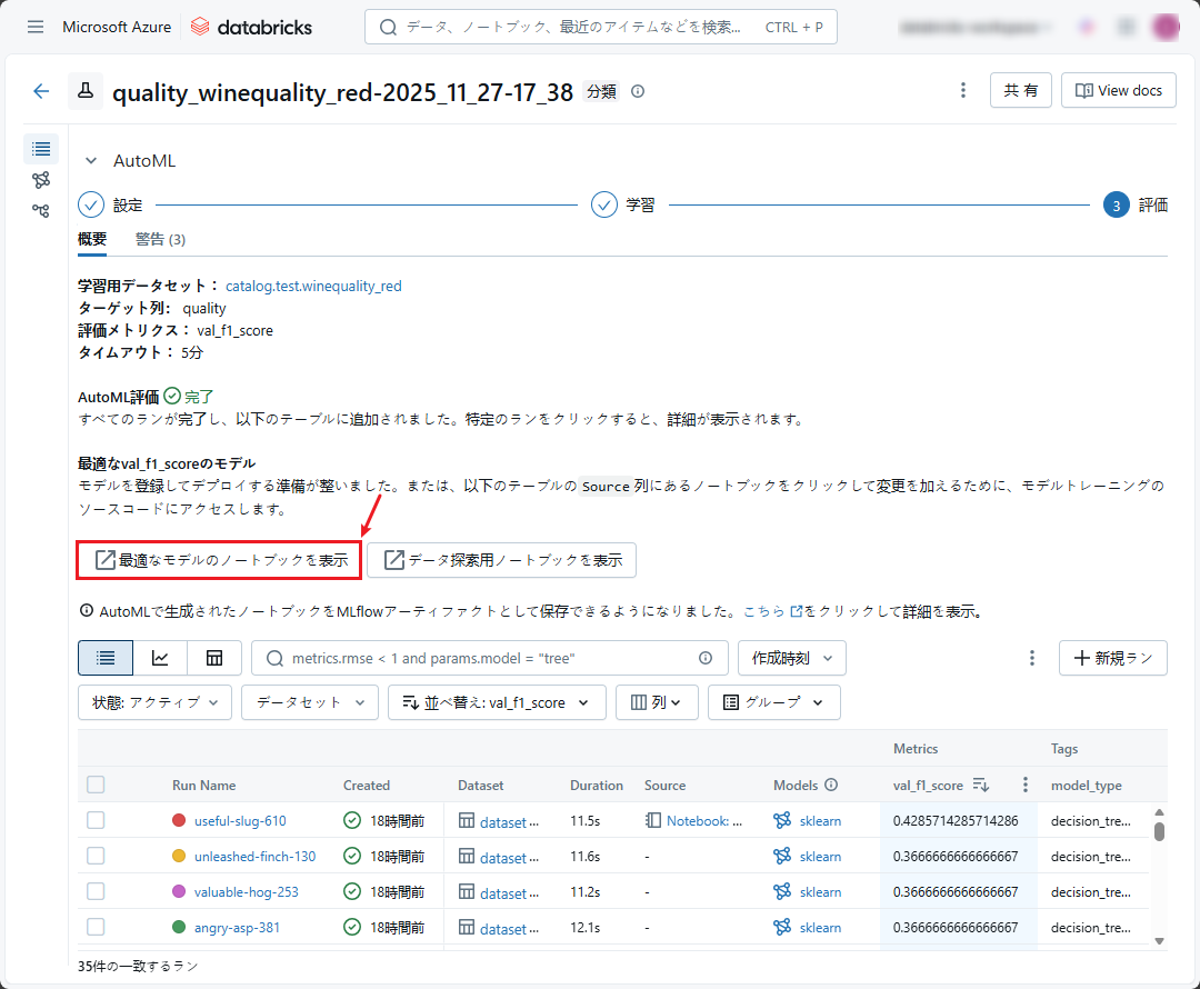 前述の通り、Databricks AutoML は評価指標(f1-score)及び、最も最高評価の高いモデルに対応する最適なモデルのノートブックを表示します。