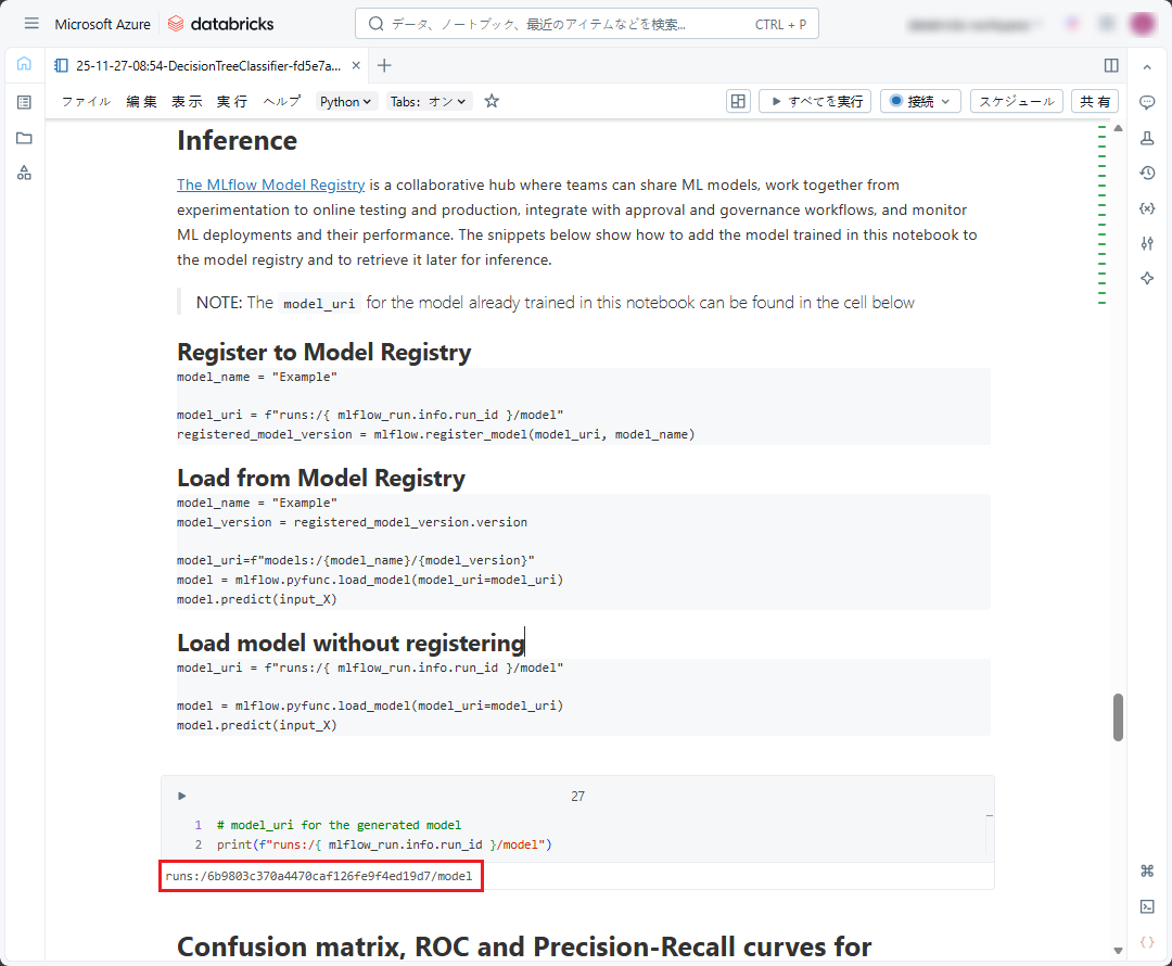 Databricks AutoML によって生成された最適なモデルの model_uri は、「 View notebook for best model 」の最後にあります。