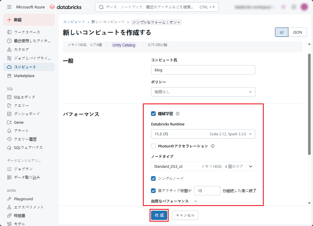 ランタイムバージョン: Databricks ランタイム 9.1 ML 以降。クラスター ML (機械学習) を使用する必要があることに注意してください。 ここでは、Scala 2.12 で Runtime 11.3 を使用します。