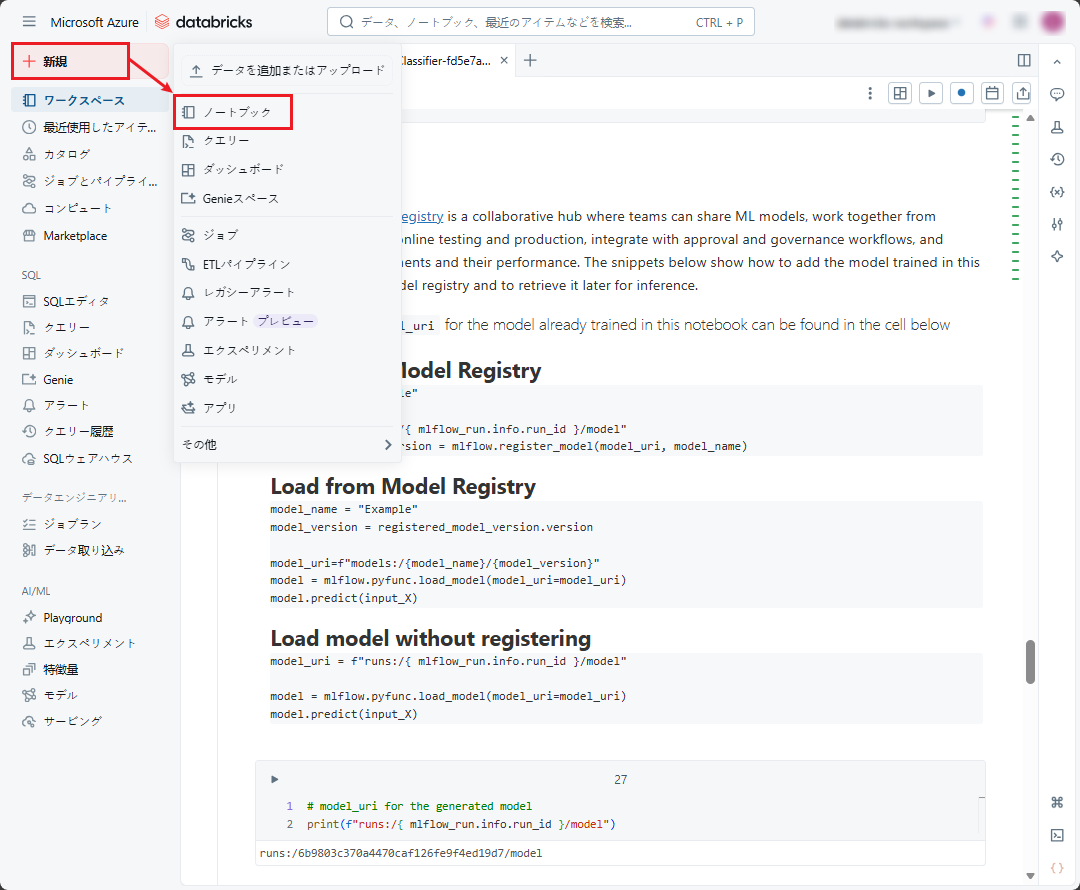 - 新規ノートブック( model_uri を使用してモデルをロードし、データを処理できるようにするため)
