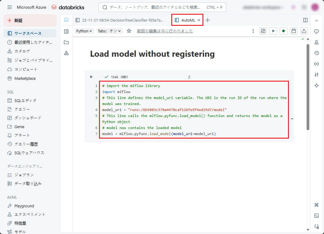 実行後、AutoML Experiment は最適なモデルをMLFlow モデル レジストリにアーティファクトとして記録し、そのモデルに model_uri という一意の識別子パスを割り当てます。
