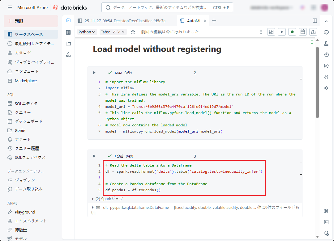 Databricks AutoML でトレーニングされたモデルが、入力データを DataFrame として受信するため、前の手順でアップロードされた Delta テーブルのデータを DataFrame 形式で読み込みます。