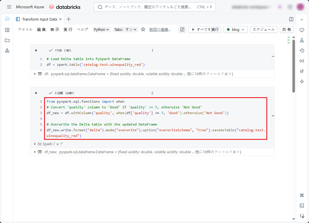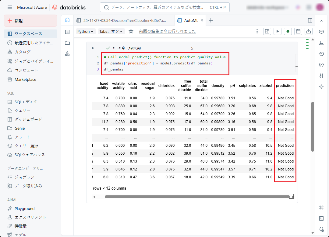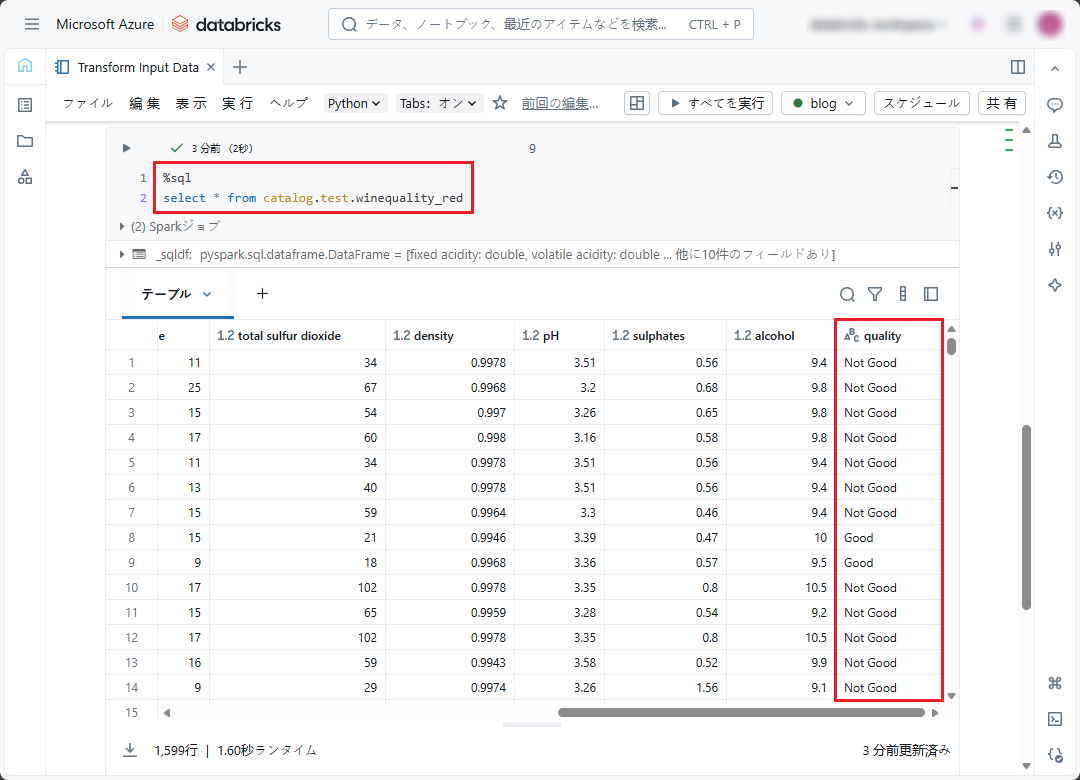- 分類問題に変換するために、 Databricks のNotebookを使用して、quality スコアを元に quality カラムをquality ブール に変換しました。
