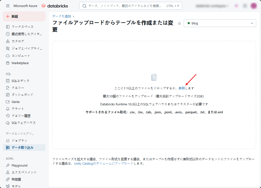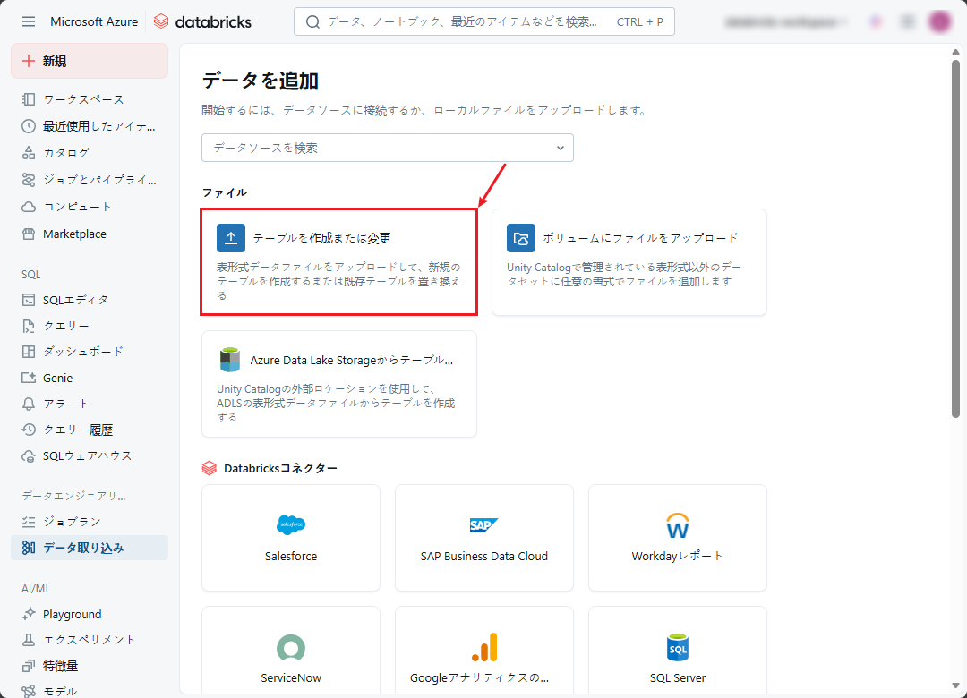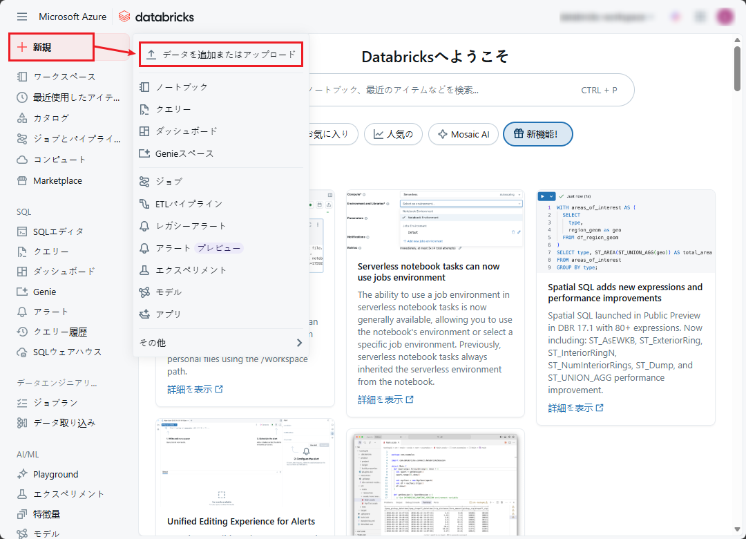 ① Azure Databricks ワークスペースで、「新規」>「データを追加またはアップロード」をクリックします。