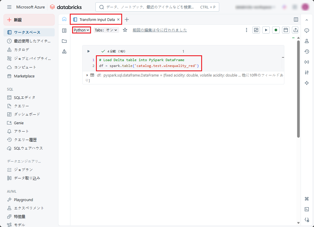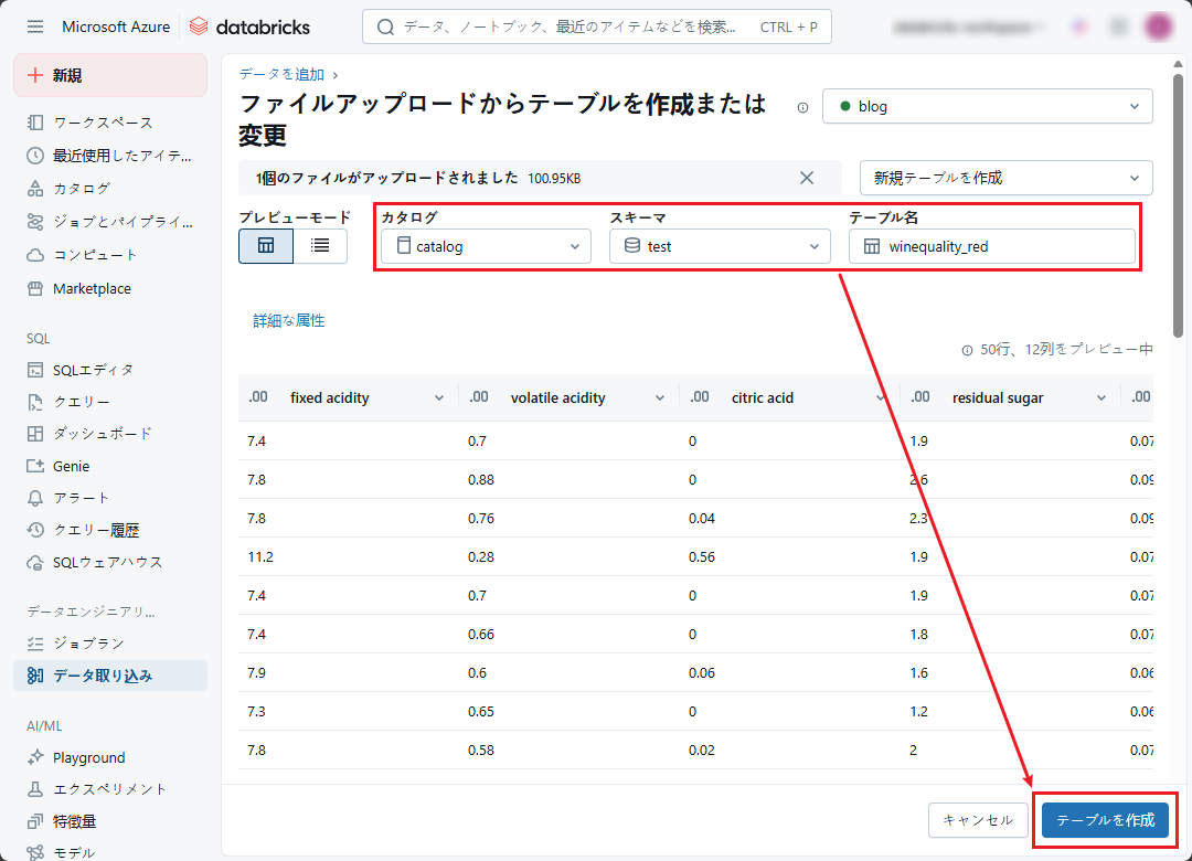 - 入力学習用データセット: Red Wine Qualityデータセットの作成したデルタ テーブルを使用します。