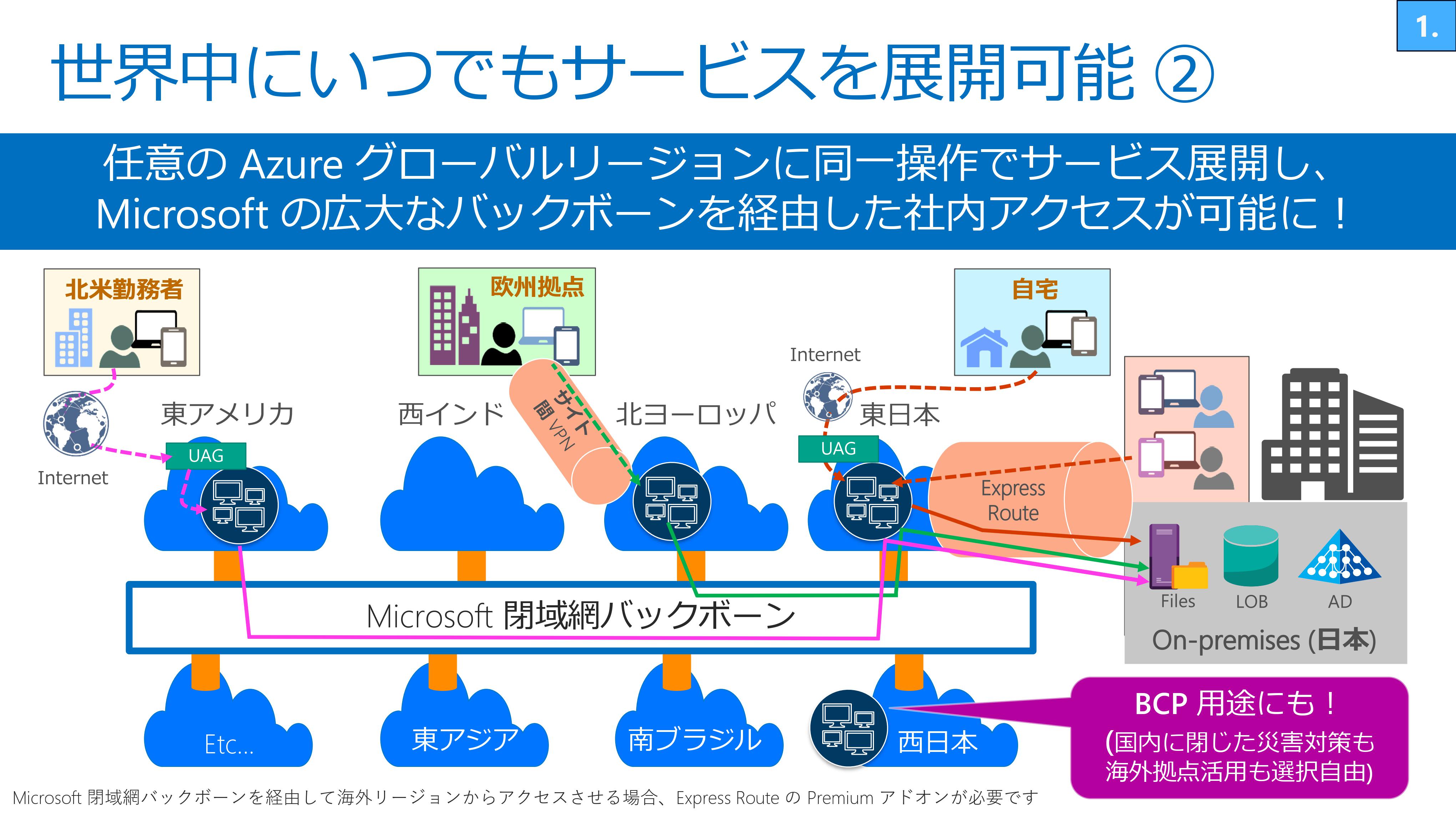 Microsoft Azure は全世界で54の拠点があり、世界中どこにいても同じように、仮想マシンやAzureの仕組みが使えます。これら拠点は、すべてがマイクロソフトの持つ世界最大級のバックボーンで接続されており、たとえばユーザーが日本にアクセスする場合にも、一般的なネット回線、Wi-Fi環境と比べ極めて高品質で低遅延な通信環境を提供します。