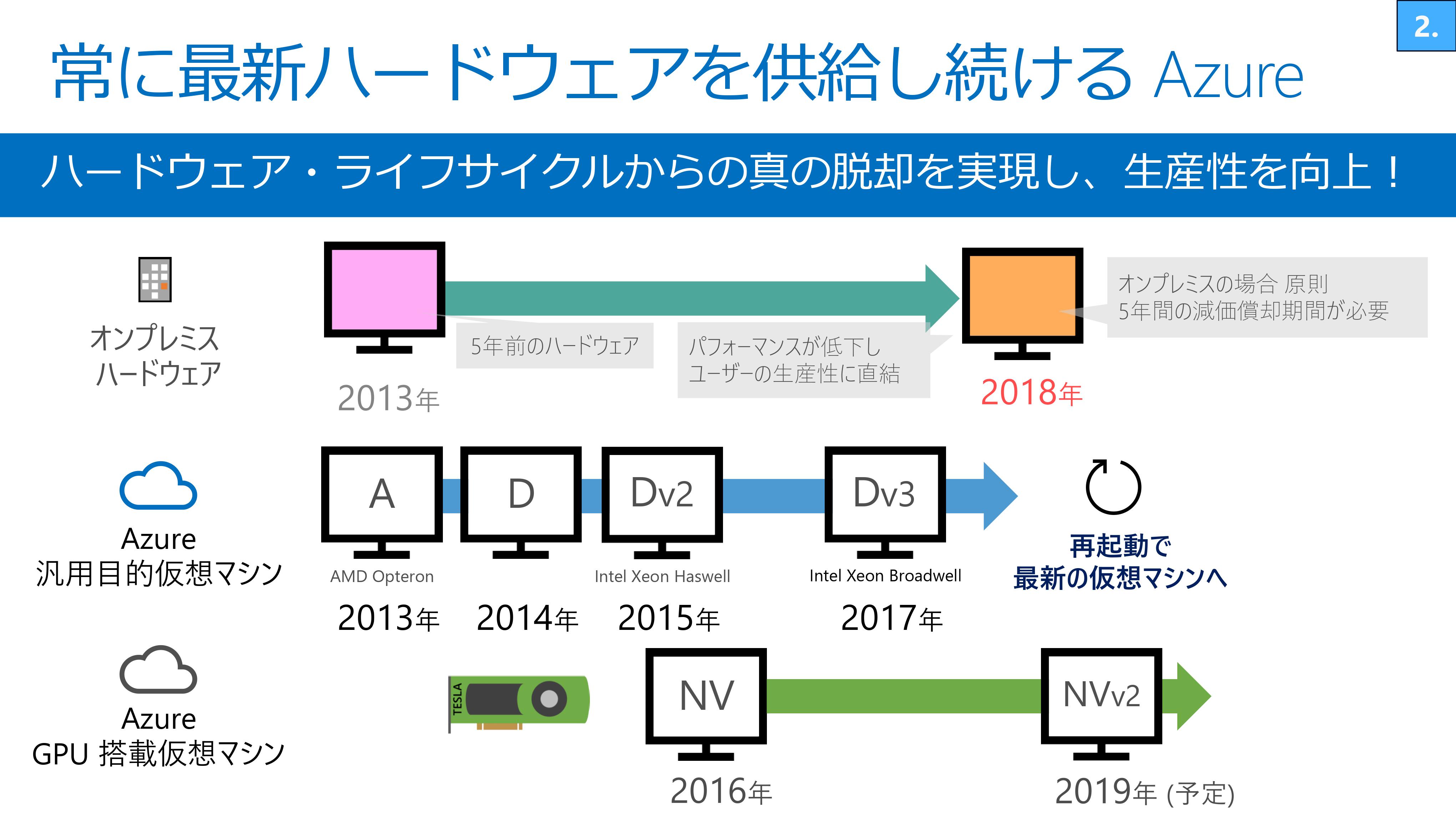 Azureは、最新のハードウェアを取り入れた仮想マシンをラインナップに加え続けており、再起動するだけで簡単に最新の環境に移行できます。Azureで提供する仮想マシンは汎用シリーズ以外に、コアあたりのメモリが増減したモデルなどを取り揃え、最適な価格でお客様の用途に応えます。