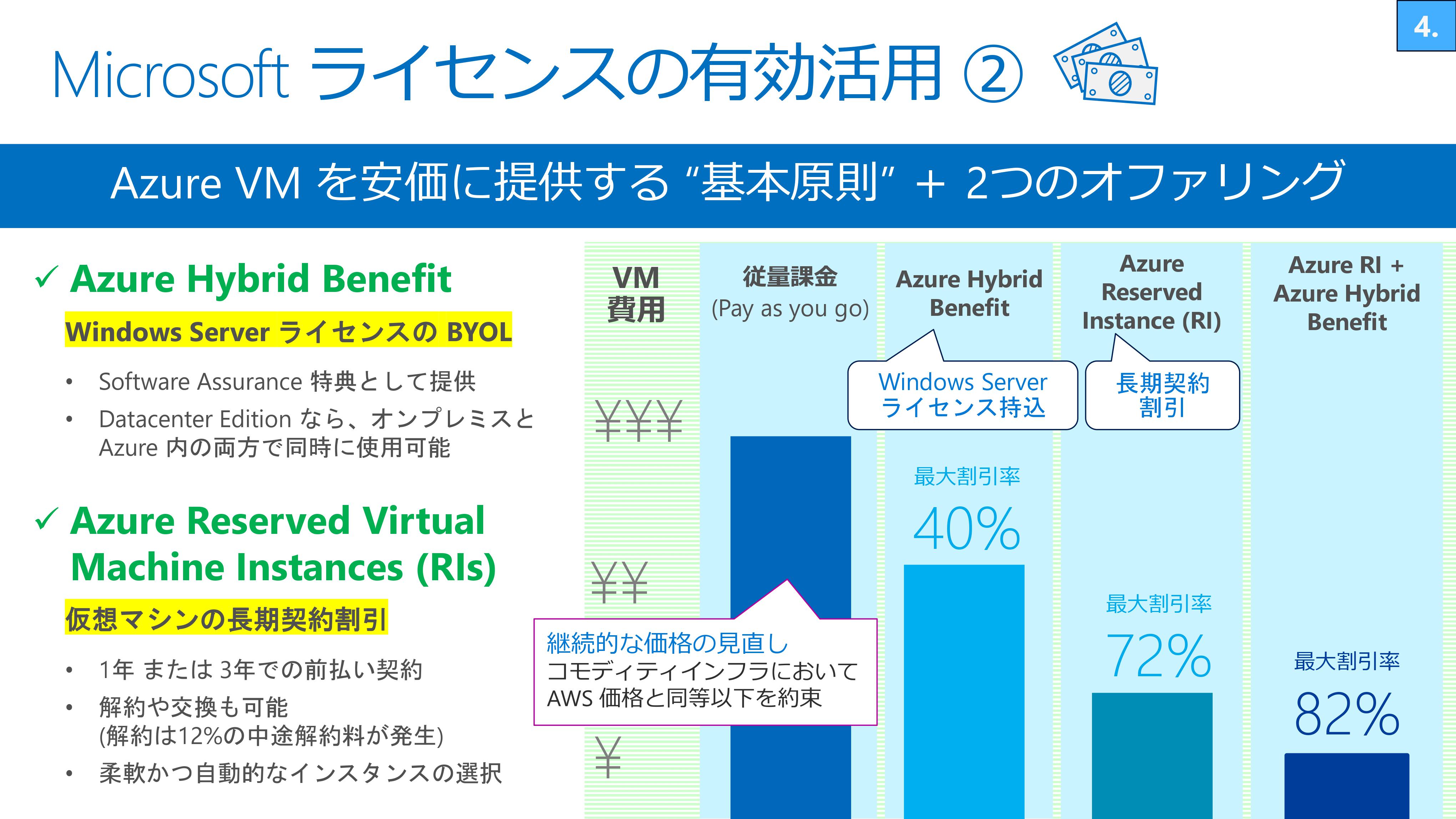 Azureおよび認定を受けたクラウドサービスでは、『Windows 10』 や『Microsoft 365 Apps for enterprise』を追加料金なしで持ち込み可能です。さらに、Azureは継続的に価格を見直すことによってAWSと同等以下の価格にて提供することを約束しています。また、Windows Serverライセンスの持ち込みと仮想マシンの長期契約、このふたつを組み合わせることで、最大で8割の値引率が実現します。