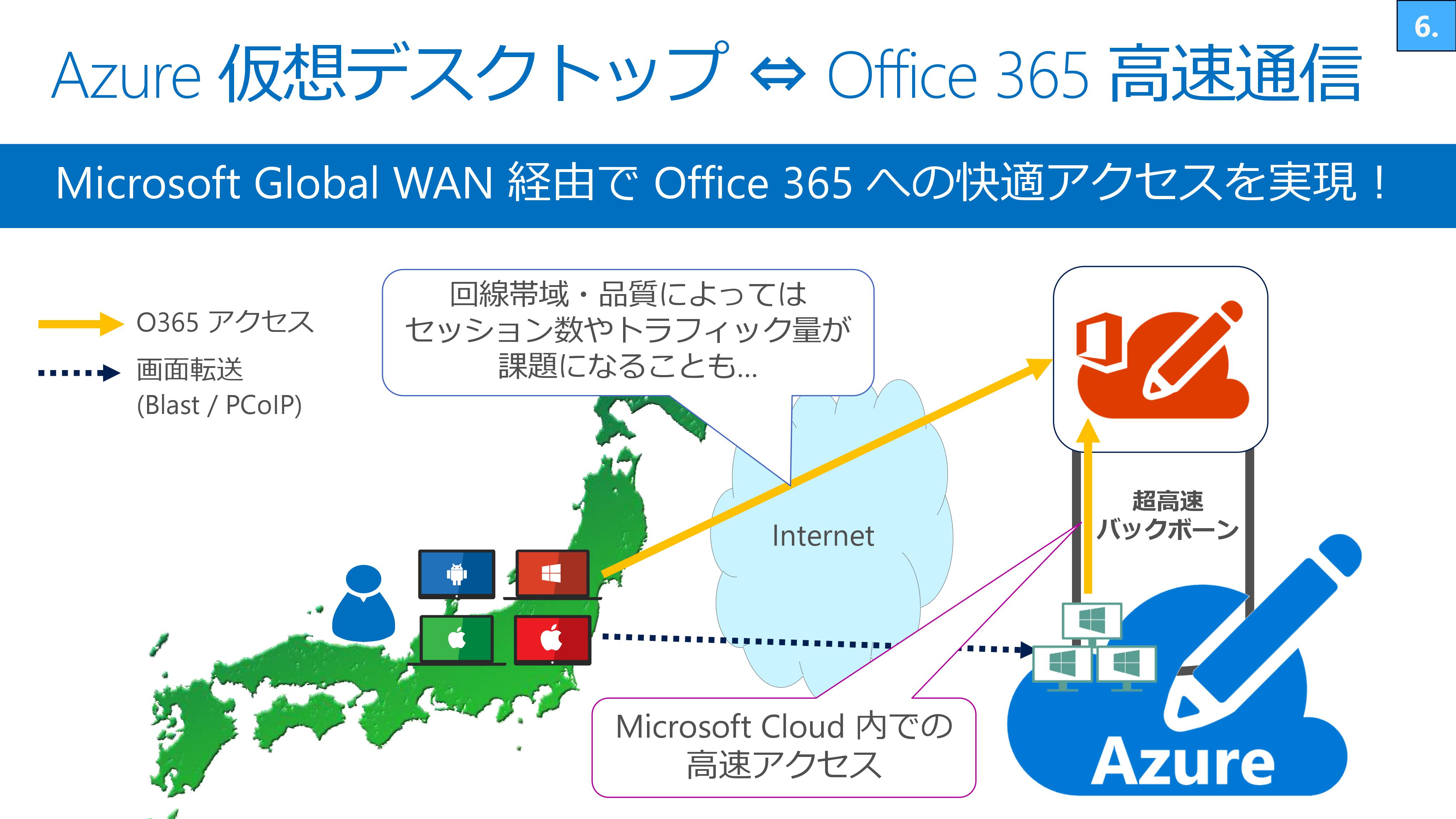 Azure上で、Horizon Cloudの仮想デスクトップ(VDI)を作り、そこでOfficeアプリケーションを動かすことができます。するとマイクロソフトの超高速なバックボーンにつながり、快適にAzureの仮想デスクトップ(VDI)から『Microsoft 365』にアクセスできます。