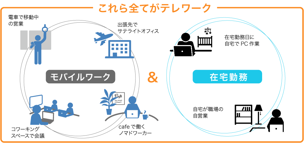 「テレ(tele) = 離れた場所」と「ワーク(work) = 働く」を合わせて作られた言葉です。 ICT (= Information and Communication Technology)を活用し、ノートPC、スマートフォン、タブレットなどを用いて場所や時間にとらわれない柔軟な働き方をすることを指します。モバイルワークや在宅勤務の働き方は、それぞれテレワークの一形態のことを指します。