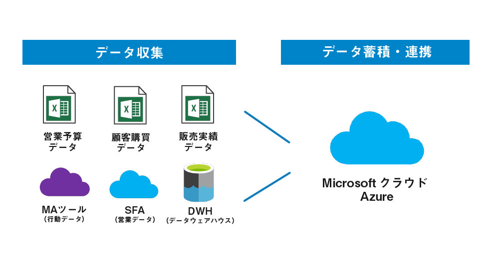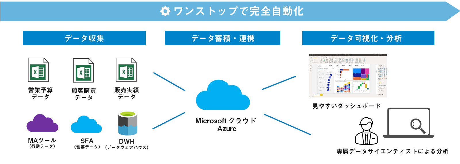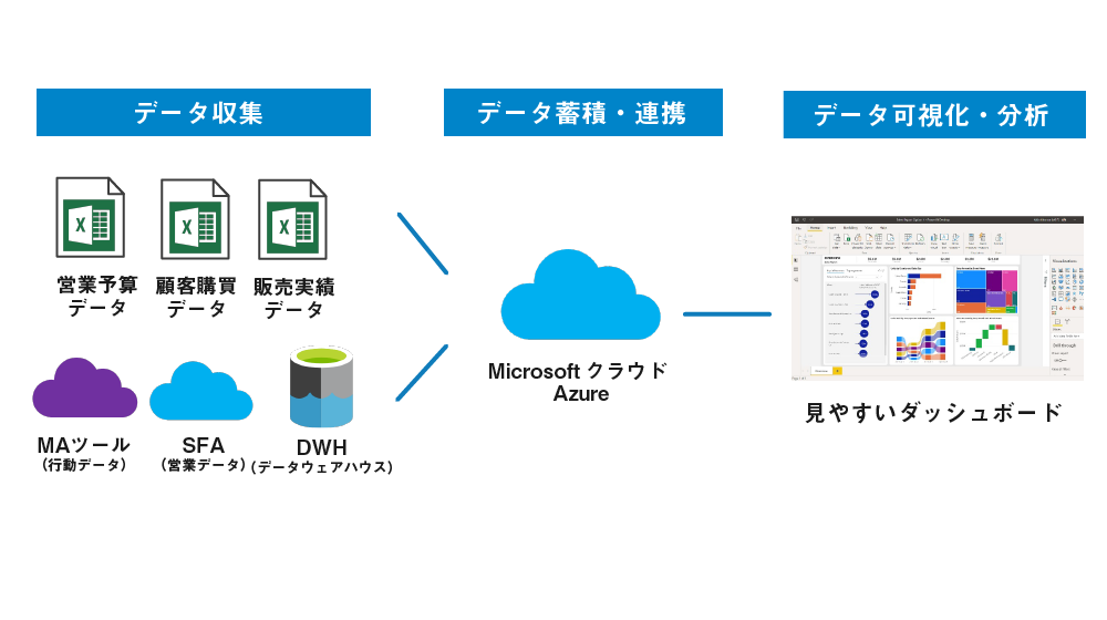 社内外に点在するデータをMicrosoftクラウド上に統合して、データ連携、分析や可視化までワンストップで繋ぎます。