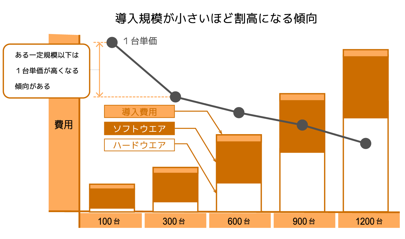 また、上記は1200ユーザー時の試算ですが、ユーザー数が一定以下になると1台当たりの費用が極端に高くなり、300ユーザーで約35万円、100ユーザーでは約58万円になります。これはユーザー数に関係なく最低限購入する必要のあるハードウエアにかかる費用を、少ないユーザー数で分割するためです。